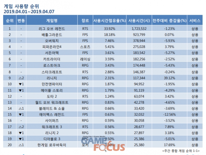 미디어웹이 제공하는 '게임트릭스 주간 종합 게임 동향(2019.04.01~2019.04.07)'에 따르면, '배틀그라운드'가 경우 전주대비 사용시간이 0.07% 증가해 2위를 유지했다. '리니지'은 '리니지 리마스터'의 효과로 전주대비 사용시간이 39.12% 증가하며 점유율 2.31%를 기록, 두 단계 상승한 9위에 자리했다. 반면, '던전앤파이터'는 한 단계 하락한 10위를 기록했다.