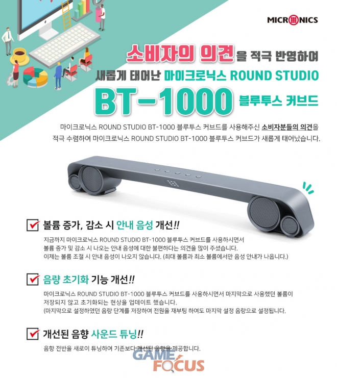 한미마이크로닉스(대표: 강현민, 이하 마이크로닉스)가 감각적인 커브드 디자인과 유무선, 휴대 사용이 가능한 다기능 스피커 '마이크로닉스 ROUND STUDIO BT-1000 커브드 블루투스(이하 ROUND STUDIO BT-1000)'의 기능 개선 업데이트를 실시한다.