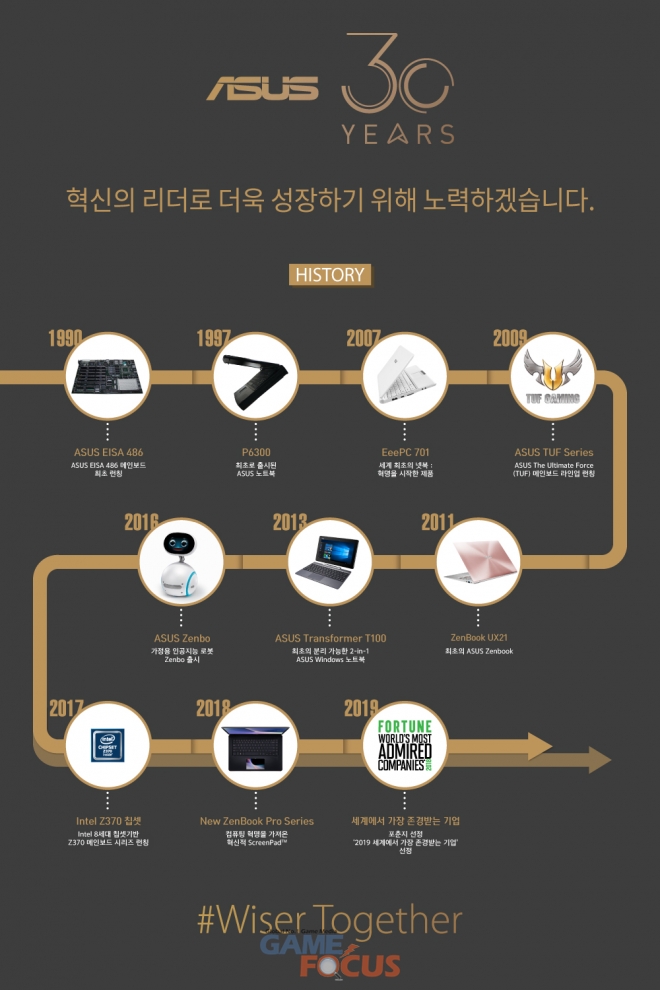 에이수스는 지난 1989년 IBM 및 ALR 제품에 사용된 Cache 386/33 및 486/25 메인보드를 최초로 출시하며, 이후 노트북, 그래픽카드, 데스크톱 및 모니터를 성공적으로 런칭 시키며, IT 하드웨어 분야의 독보적인 기업으로 자리매김했다. 2016년에는 에이수스의 최초 가정용 AI 로봇인 Zenbo를 공개하여 많은 이목을 끌었으며, 올해인 2019년도에는 포춘지에서 '2019 세계에서 가장 존경받는 기업' 중 한 곳으로 선정되었다.