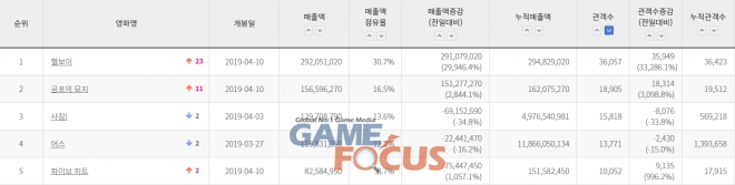영화 '헬보이'가 개봉과 동시에 외화 박스오피스 1위를 차지했다. 영화진흥위원회 통합전산망(4월 11일(목) 오전 7시 기준)에 따르면, '헬보이'는 개봉 첫 날에 36,057명의 관객을 동원하며 외화 박스오피스 정상에 올랐다.