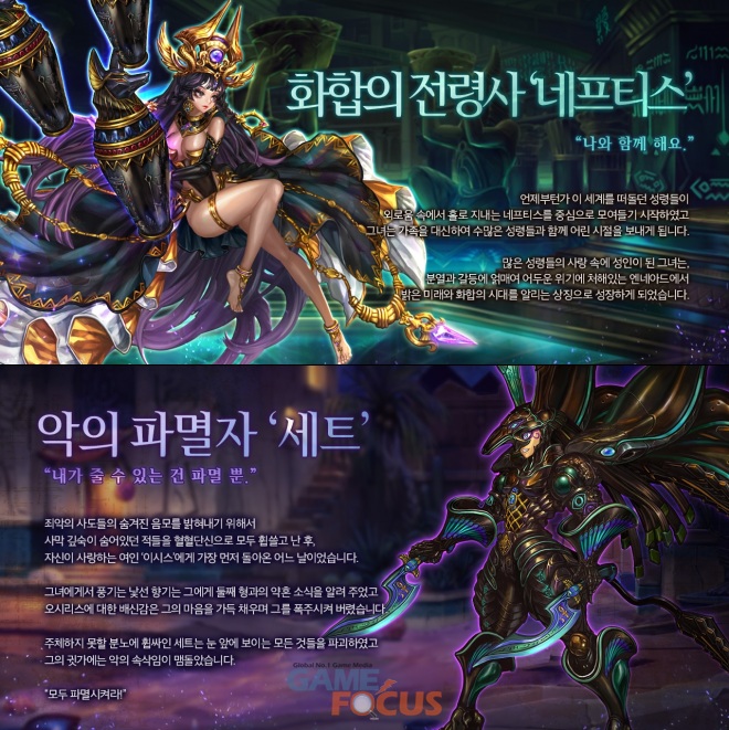 이와 함께 신규 동료 2종 '네프티스(소환사)'와 '세트(무사)'도 등장한다. 이 밖에도 장비 강화에 사용되는 강화석을 1종으로 통합, 장비 강화 단계를 아크 단계까지 확장하는 등 장비 강화 시스템을 대폭 업그레이드된다.