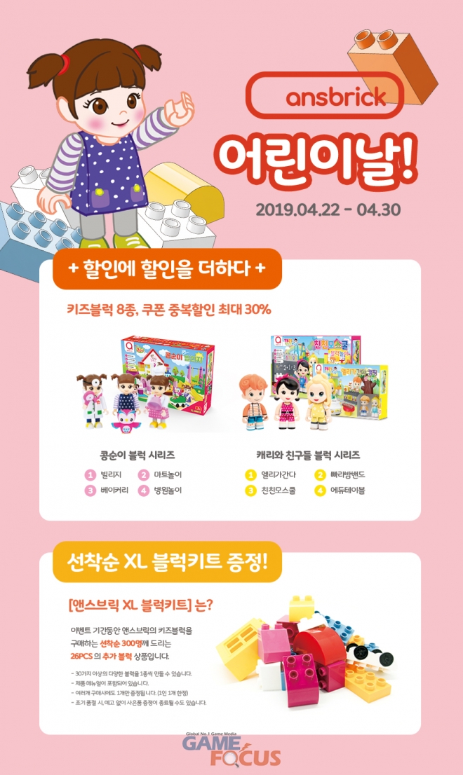 이번 행사는 블록 완구에 관심 있는 소비자들을 대상으로 콩순이, 캐리와 장난감 친구들 블록 완구 상품을 11번가와 앤스브릭에서 제공하는 쿠폰을 중복 사용 시 최대 30% 할인된 가격으로 구매할 수 있다. 또한 구매자 선착순 300명을 대상으로 30가지 이상의 다양한 조립 매뉴얼이 포함된 추가 블록 키트를 증정할 예정이다.