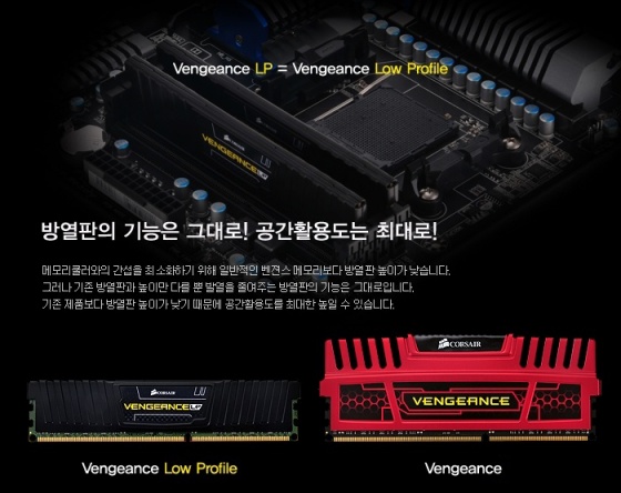 이번에 출시되는 커세어 벤전스 제품은 Low Profile의 약자인 LP가 붙은 제품으로서 기존 벤전스 제품보다 방열판의 디자인이 함축적으로 변하며, 높이가 낮아져 크기가 확연히 줄어든 모습이다. 이러한 디자인은 CPU쿨러나 메모리 전용 쿨러 등 시스템을 구성하는 다른 요소들과의 간섭 우려를 최소화 하여 사용자에게 시스템 내부의 효과적인 구성이 가능토록 하였다.