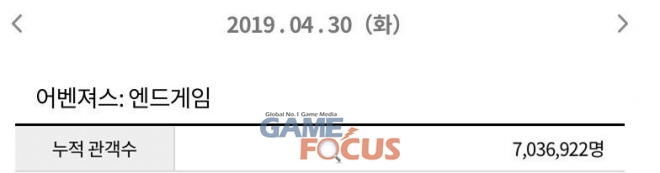 2019년 전 세계 최고의 화제작 '어벤져스: 엔드게임'(수입/배급: 월트디즈니컴퍼니 코리아)이 영진위통합전산망 배급사 실시간 티켓 발권 기준, 개봉 7일째인 4월 30일(화) 오전 총 관객수 700만 명을 기록했다.