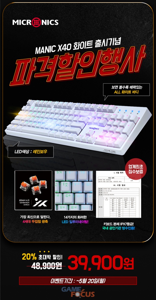 마이크로닉스는 MANIC X40 화이트 출시를 기념하여 5월 20일까지 2주간 소비자가 49,900원에서 20% 할인된 39,900원에 출시 기념 특가를 진행한다. 모든 판매점에서 할인된 가격에 구매 가능하며 별도 수량 제한 없이 행사 기간 할인 특가가 진행된다.