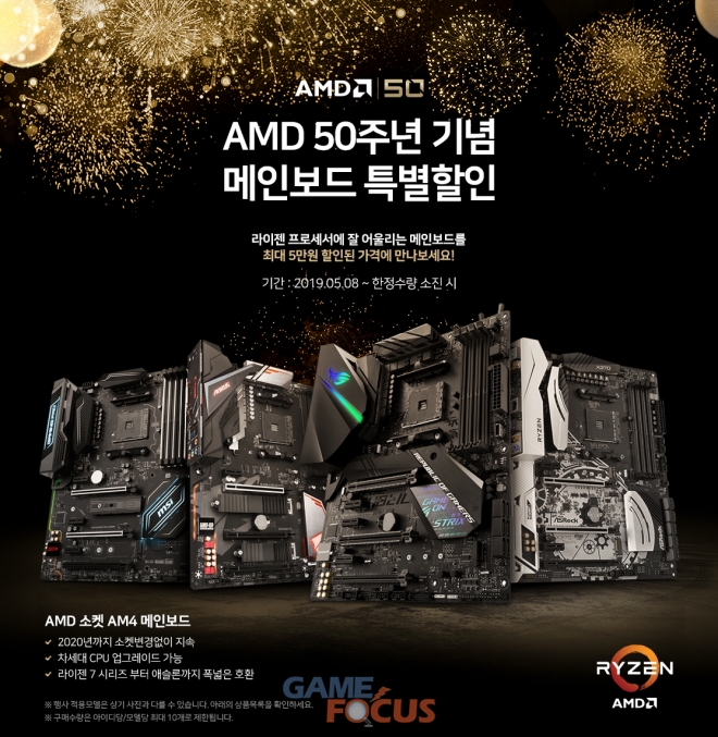 5월 8일부터 진행되는 본 프로모션에서 에이수스는 메인보드 할인 행사의 파트너로 참여한다. 에이수스의 프로모션 대상 제품은 에이수스의 모든 AM4 기반 메인보드들 중에서도 소비자들의 가장 높은 지지를 받고 있는 PRIME A320M-K, EX-A320M-GAMING, PRIME B450M-A, PRIME X470-PRO, ROG CROSSHAIR VII HERO의 5종이며, 최대 5만원까지 할인된 가격으로 제품을 구매할 수 있다.