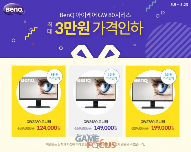 벤큐 모니터 공식 수입원 피치밸리(대표 정재윤)와 함께 5월 9일부터 23일까지 진행되는 이번 행사는 벤큐 GW2780은 기존가 대비 3만원 할인한 199,000원에, GW2480은 1만원 할인된 149,000원에, GW2280은 5천원 할인된 124,000원에 판매하는 행사이다.
