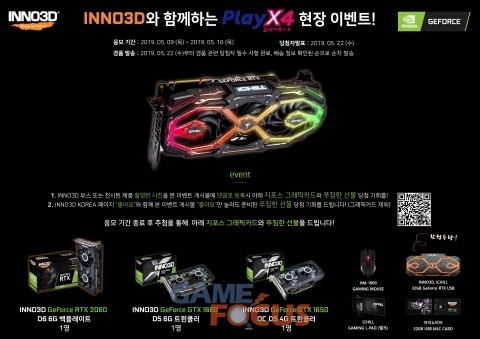 한편, 아이노비아는 이번 전시와 함께 다양한 경품을 지급하는 행사를 진행한다. INNO3D KOREA 페이스북을 통해 PlayX4 INNO3D 부스 또는 전시된 제품을 촬영 후 INNO3D KOREA 페이스북 PlayX4 행사 게시물에 댓글로 등록하면 추첨을 통해 INNO3D RTX 2060 D6 6GB [X2] 백플레이트, INNO3D GTX 1660 D5 6GB [트윈쿨러], INNO3D GTX 1650 D5 4GB [트윈쿨러], INNO3D iCHILL USB 메모리 등 다양한 경품을 선물한다.