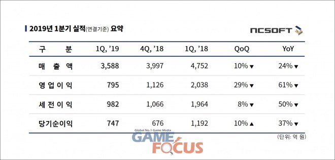 엔씨소프트(대표 김택진, 이하 엔씨(NC))가 2019년 1분기 실적 결산(연결기준) 결과 매출 3,588억 원, 영업이익 795억 원, 당기순이익 747억 원을 기록했다.