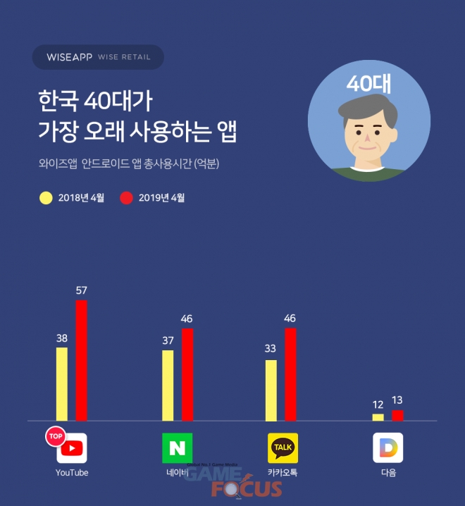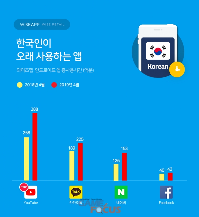 먼저 YouTube는 작년 4월 총 이용시간 258억 분에서 올 4월에는 388억 분으로 50% 성장했다. '국민 메신져' 카카오톡은 작년 4월 총 이용시간 189억 분에서 올 4월 225억 분으로 19% 성장했으며, 네이버는 작년 4월 총 이용시간 126억 분에서 올 4월 153억 분으로 21% 성장했다. 마지막으로 Facebook은 작년 4월 총 이용시간 40억 분에서 올 4월 42억 분으로 5% 성장했다.