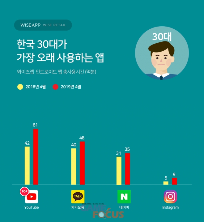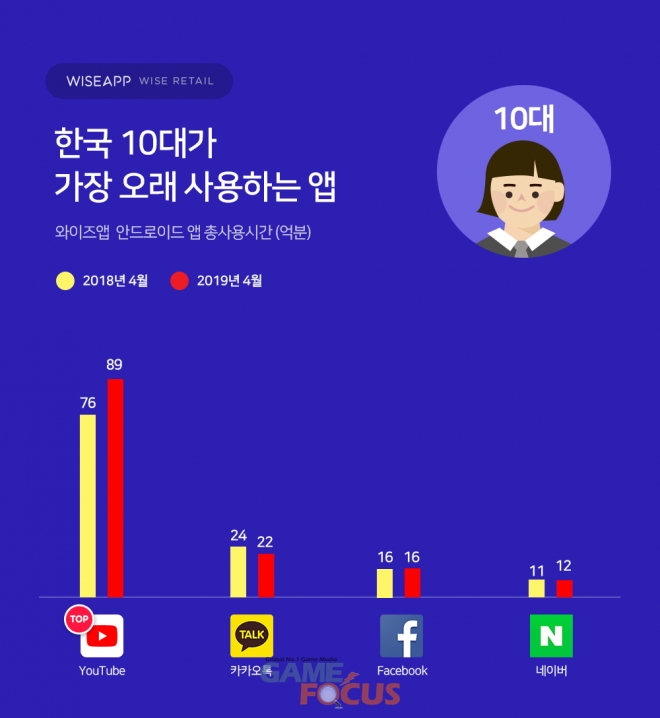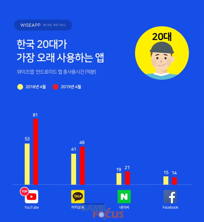 전 세대를 합쳐 한국인이 가장 오래 사용한 앱은 YouTube로 4월 한 달 총 사용시간 388억 분을 이용했다. 그 뒤를 카카오톡 225억 분, 네이버 153억 분, Facebook 42억 분의 순이었다.
