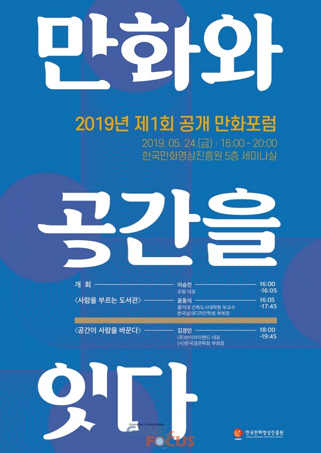 한국만화영상진흥원(이사장 김동화)이 오는 24일(금) 오후 4시, 5층 세미나실에서 2019년 제1회 공개 만화포럼 '만화와 공간을 잇다'를 개최한다.