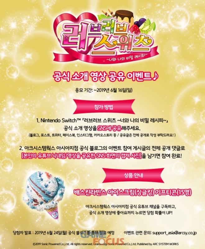 아크시스템웍스 아시아지점은 디저트 만들기 체험 게임 '러브러브 스위츠 ~너와 나의 비밀 레시피~' 의 Nintendo Switch 한국어 번역판을 출시하며, 게임의 공식 소개 영상을 공유하면 추첨을 통해 아이스크림 기프티콘을 받을 수 있는 이벤트를 실시한다.