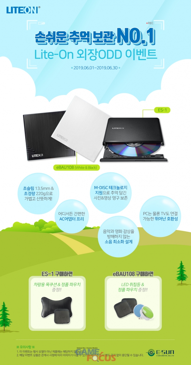 오는 31일까지 6월 한달 간 진행되는 이번 행사는 라이트온 외장 ODD 제품인 ES-1과 eBAU1084를 대상으로 실시된다. 제품 구매 시 전용 파우치를 구매자 전원에게 기본으로 증정하며, ES-1 구매시 차량용 목쿠션을, eBAU1084 구매시에는 4가지 색과 4가지 모양의 LED 수면등을 추가 증정한다.