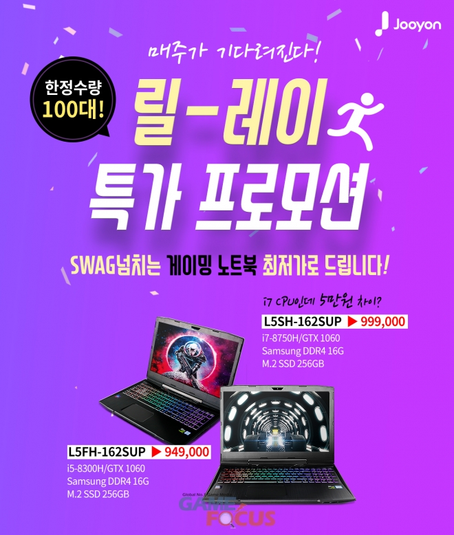 주연샵 릴레이 특가 프로모션 1주차는 인텔 8세대 CPU i5-8300H · GTX 1060이 탑재된 L5FH-162SUP모델과 인텔 8세대 CPU i7-8750H · GTX 1060이 탑재된 L5SH-162SUP모델 등 8세대 게이밍 노트북 2종을 100대 한정으로 선보이며 각각 949,000원, 999,000원으로 동일 사양 최저가로 판매한다.