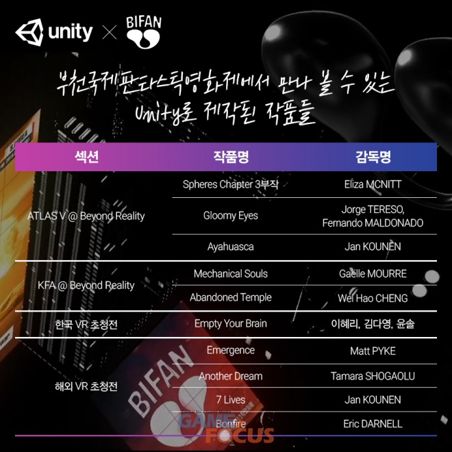 유니티는 게임엔진사 최초로 부천국제판타스틱영화제에 참가해 공식 부스를 운영하고, M&E(미디어 및 엔터테인먼트) 분야의 유니티 활용에 대한 세션들을 진행할 예정이다. 또한 영화제 기간 중 유니티로 제작된 다양한 콘텐츠가 선보여질 예정이다.