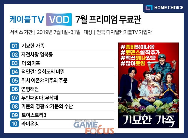 디지털케이블TV에서 '기묘한 가족' 등 10편의 VOD를 '7월 프리미엄 무료관'을 통해 무료로 제공한다. 프리미엄 무료관은 CJ헬로, 딜라이브, 티브로드, 현대HCN, CMB 등 디지털케이블TV 가입자 750만명을 대상으로 서비스된다.