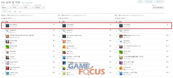 출시 5시간만인 어제 밤 12시경 한국과 미국, 일본 등을 비롯한 전 세계 모바일 게임 주요 시장 13개국 애플 앱스토어 인기 순위 1위에 처음 이름을 올린 BTS 월드는 현재 총 82개국에서 인기 순위 Top 5에 진입했다.