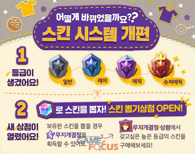 이번 업데이트에서는 스킨 상점에서 무작위로 쿠키 스킨을 획득할 수 있는 스킨 뽑기 상자도 선보였다. 무지개 큐브로 원하는 스킨을 확정 구매할 수 있는 기존 방식을 그대로 유지하면서, 그보다 적은 개수의 무지개 큐브로도 쿠키 스킨을 뽑아볼 수 있는 기회를 마련한 것이다.