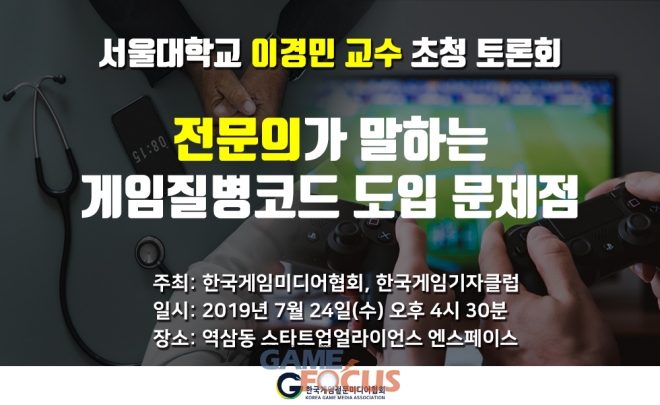 한국게임미디어협회(KGMA, 회장 이택수)와 한국게임기자클럽(KGRC)이 오는 24일 서울 역삼동 스타트업얼라이언스 엔스페이스에서 서울대학교 의과대학 인지과학전공의 이경민 교수를 초청 게임 질병코드 관련 토론회를 진행한다.