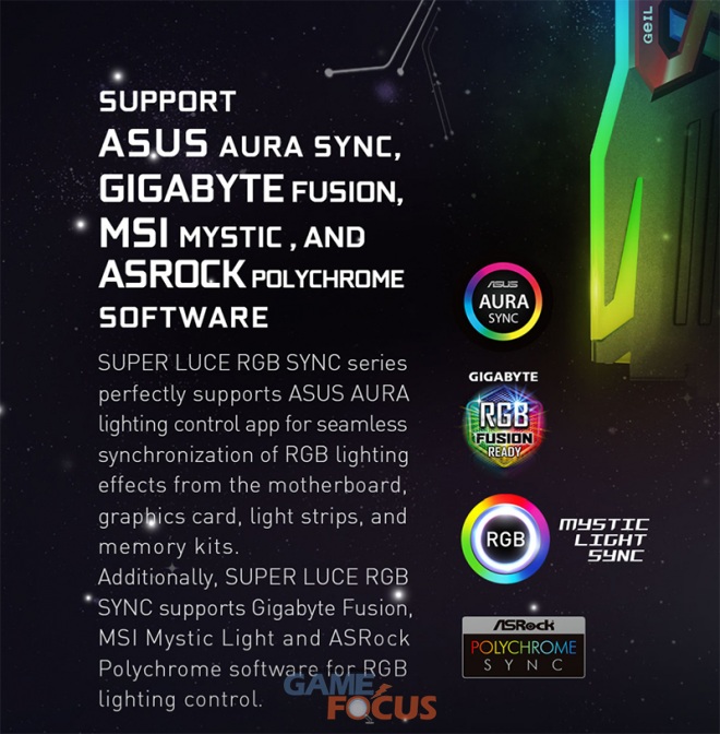 슈퍼 루스 RGB 싱크 시리즈는 주요 메인보드 제조사의 RGB 관리 프로그램인 ASUS 의 AURA SYNC, 기가바이트의 RGB FUSION 2.0, MSI 의 MYSTIC LIGHT, ASROCK 의 POLYCHROME SYNC 까지 완벽하게 지원해 1,680만 가지에 이르는 다채로운 색상과 패턴의 RGB 튜닝을 시스템에 적용할 수 있다.