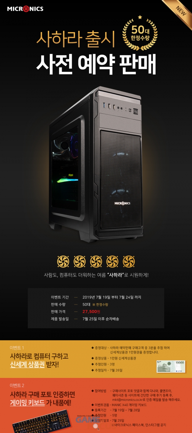 마이크로닉스가 실시하는 예약 특가 이벤트는 쿨링 극대화 미들케이스 SAHARA의 출시를 기념하기 위한 이벤트로 사전 예약시 특전으로 판매 쇼핑몰당 구매자 3명을 추첨해 각각 1만원권 상품권을 증정할 예정이다. 추가로 예약 판매 참여자 전원에게는 구매후기 이벤트에 참여할 수 있는 기회도 제공된다. 간단구매후기 이벤트는 19일부터 28일까지 하드웨어 커뮤니티인 쿨엔조이, 퀘이사존, 다나와DPG 등에 간단구매후기를 작성한 후, 해당 내용을 마이크로닉스로 공유 시 5명을 추첨해 IPX7 방수인중과 4세대 지시엔 광축이 적용된 X40 키보드를 증정하는 이벤트다.
