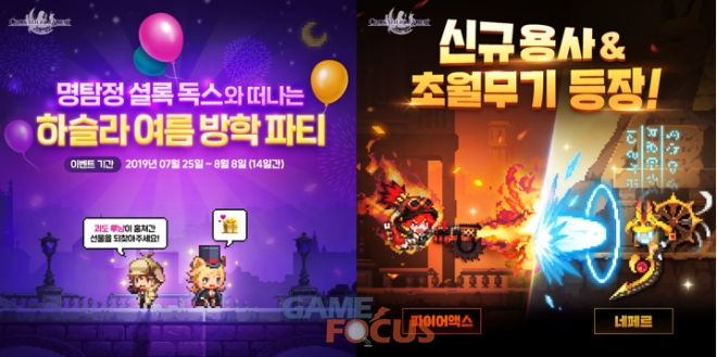 '명탐정 셜록 독스와 떠나는 하슬라 여름방학 파티'는 두 가지 이벤트가 열린다. 먼저 용사단장이 준비한 선물을 '괴도 루냥'이 훔쳐가버려 명탐정 셜록 독스와 함께 독스의 예리한 후각으로 곳곳에 숨겨둔 선물을 찾는다는 컨셉의 이벤트다. 매일 2회 주사위를 굴리고 마음에 드는 선물 칸에 도착하면 해당 선물을 담을 수 있다. 선물은 4성 초월무기/용사 선택권과 브리짓포인트, 그리고 옵션 변경권 등 다양한 구성으로 제공될 예정이다.
