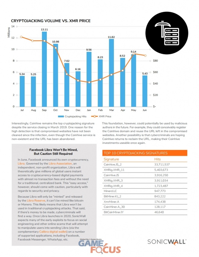 크립토재킹은 올해 첫 6개월간 5천 270만 건을 기록하며 지난 2018년 6개월과 비교하여 9% 증가한 수치를 보였다. 이러한 증가의 부분적인 원인은 비트코인과 모네로 가격이 상승하면서 크립토재킹이 사이버 범죄자들에게 유리한 옵션이 되었기 때문이다. 코인하이브(Coinhive)는 2019년 3월 서비스가 종료 됐음에도 불구하고 여전히 최고의 크립토재킹 서명으로 남아있다. 감지율이 높은 이유 중 하나는 코인하이브 서비스가 존재하지 않고 URL이 삭제되었음에도 불구하고 감염 이후 손상된 웹 사이트가 제거되지 않았기 때문인 것으로 나타났다.