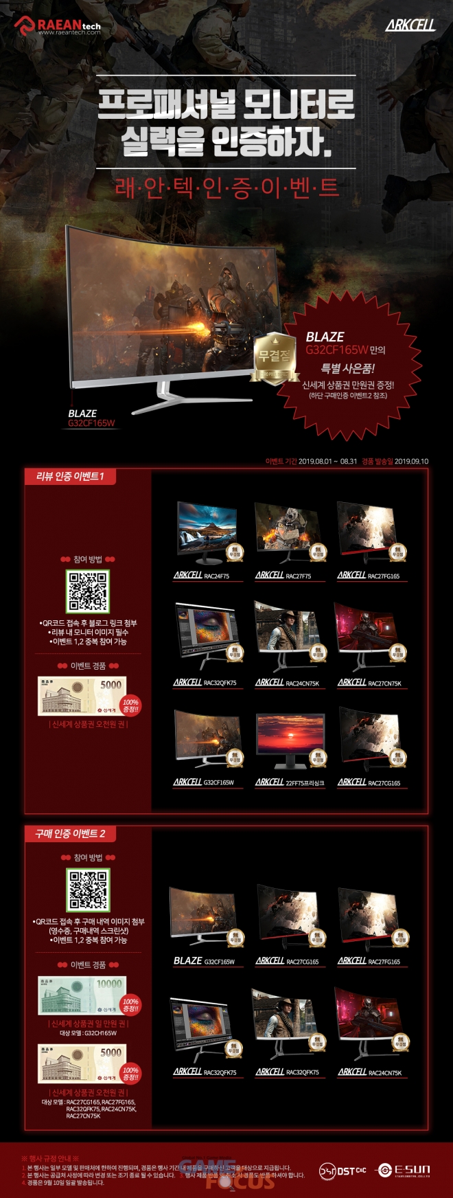 이벤트가 적용되는 제품군은 리얼한 색감 표현과 부드러운 움직임을 보여주는 무결점(ZERO PIXEL DEFECT) 게이밍 모니터들을 기반으로 ARKCELL RAC24F75 게이밍, RAC27F75, ARKCELL RAC27CG165 게이밍 커브드, ARKCELL RAC27FG165 게이밍, 래안텍 G32CF165W 커브드HDR, ARKCELL RAC32QFK75, RAC24CN75K, RAC27CN75K, ARKCELL22FF75 프리싱크 75 등 총 9개의 모델이 해당된다.