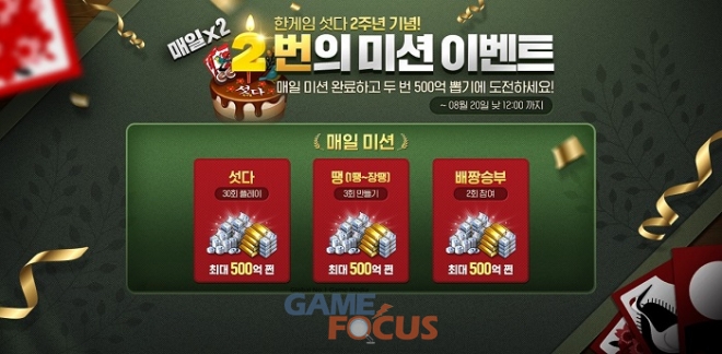 매일 미션을 완료하면 뽑기권을 제공하는 이벤트도 진행하고 있다. 판수 플레이 미션, 땡만들기 미션, 배짱승부 참여 미션까지 총 3개의 미션을 제공하며, 각 미션은 매일 2번씩 완료 가능하다. 미션 완료 시 지급되는 뽑기권을 통해 최대 500억을 획득할 수 있다.