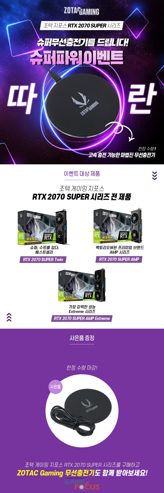 조텍코리아(ZOTAC Korea, 대표이사 김성표)가 더욱 강력해진 그래픽 성능을 자랑하는 ‘조텍 게이밍 지포스 RTX 2070 SUPER 시리즈’ 구매자 대상으로 특별 사은품을 증정하는 ‘슈퍼 파워 이벤트’를 진행한다.