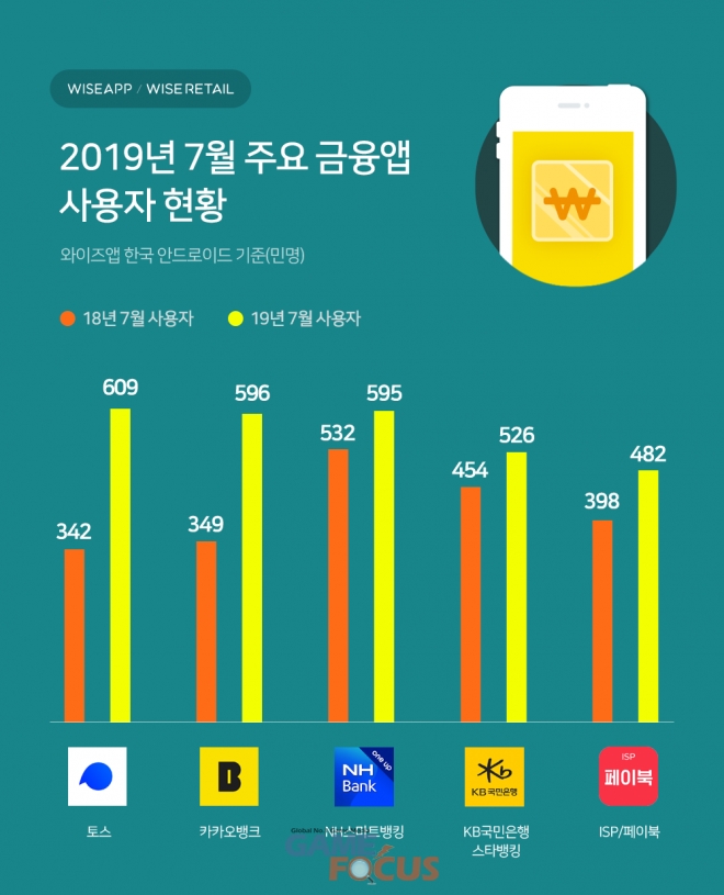 앱/리테일 분석서비스 와이즈앱/와이즈리테일이 지난 7월 한국 안드로이드 스마트폰 기준 금융앱 사용자 수 현황을 발표했다.