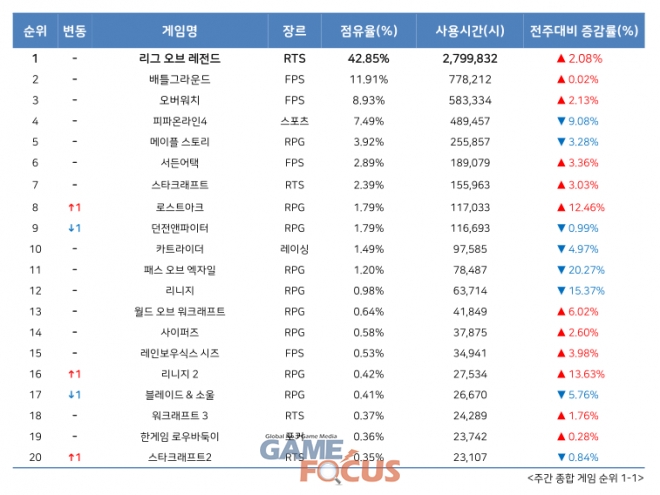 '패스 오브 엑자일'은 점유율 1.20%로 11위를 지켰으나 사용시간이 크게 하락했다. 최근 정식으로 PC방 서비스를 시작한 '레인보우식스 시즈'가 0.53%로 15위에 올랐으며, '리니지2'는 사용시간이 13.63% 증가하면서 16위를 기록했다.