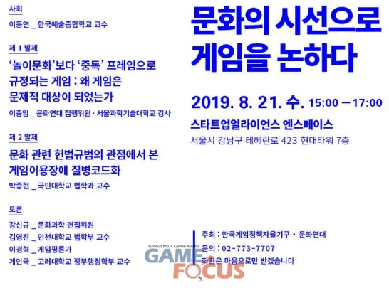한국게임정책자율기구와 문화연대가 '문화의 시선으로 게임을 논하다'를 주제로 오는 8월 21일 수요일 오후 3시부터 스타트업얼라이언스 엔스페이스에서 공동으로 학술세미나를 개최한다.