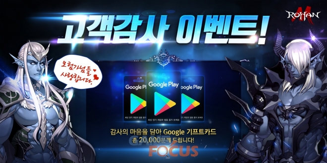 플레이위드(대표 김학준)가 자사가 서비스 중인 대표 모바일 MMORPG '로한M'에서 4주간 2만명에게 구글 기프트 카드를 증정하는 대규모 고객 감사 이벤트를 진행한다.