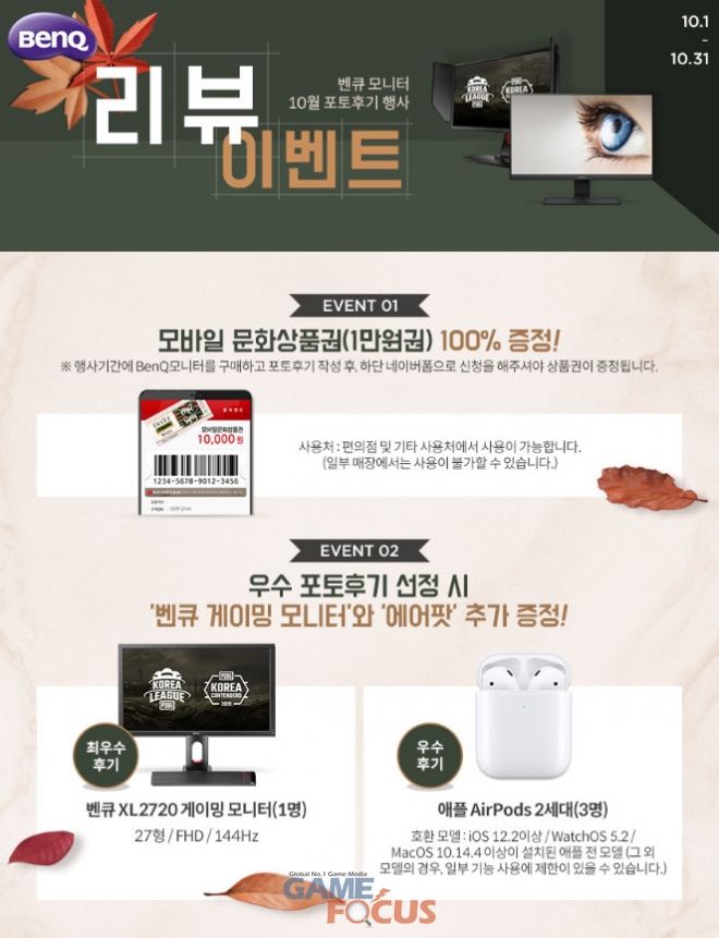 벤큐 포토후기 이벤트는 벤큐 모니터를 구입하고 모니터 사진과 함께 후기를 작성하여 네이버 폼으로 구매 증빙자료를 올린 모든 분들에게 모바일 문화상품권(1만원 권)을 100% 증정하며, 포토후기 최우수 리뷰로 선정된 1명에게는 배틀그라운드 공식 경기모니터로 잘 알려진 144Hz 모니터 XL2720을, 우수후기로 선정된 3명에게는 풍부한 고품질 사운드를 제공하는 에어팟 2세대를 추가로 증정하는 행사이다.