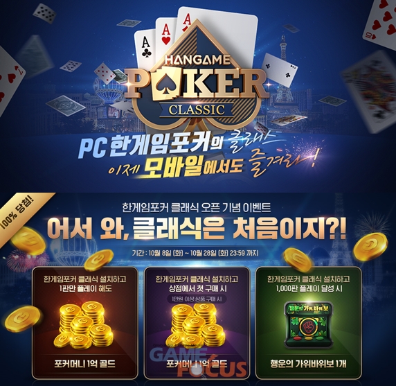원스토어 출시를 기념한 '어서와, 클래식은 처음이지?!' 이벤트는 각각의 미션을 달성하면 100% 보상을 지급하는 방식으로 이루어진다. ▲앱 설치 후 클래식에서 1판 이상 플레이 시, 포커머니 1억 골드를 지급하고, ▲상점에서 1만원 이상 첫 구매시 모든 이용자에게 역시 1억 골드를 추가로 제공한다.