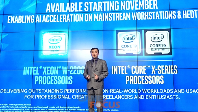이어서 이주석 인텔 코리아 전무는 최신 인텔 제온과 인텔 코어 X-시리즈 프로세서를 선보였다. 이번에 공개된 인텔 제온 W-2200 프로세서는 전문 크리에이터를 위해 제작된 프로세서로 4K 비디오 편집, 3D 렌더링 및 게임 개발 등에 최적화된 플랫폼이다. 인텔 코어 X-시리즈는 프리랜서 및 마니아용 18코어 제품군이다.