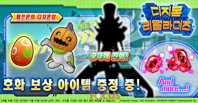 게임의 론칭에 앞서 모집된 사전 등록자는 100만 명을 넘어섰으며, 반다이남코 측은 이에 보답하는 마음으로 글로벌판에서 궁극체가 선행 등장하는 펌프몬 계통 디지몬알을 비롯해 디지루비(인게임 아이템), 진화 코드(진화용 아이템) 등을 보상으로 증정한다고 밝혔다. 또한, 게임 공략에 유리한 아이템을 대량으로 획득할 수 있는 '스타트 대시 로그인 보너스'도 진행된다.