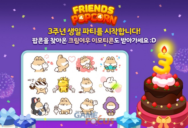 '프렌즈팝콘'은 서비스 3주년을 맞아 다채로운 이벤트를 진행하고 풍성한 경품을 증정한다. 먼저, 11월 12일(화)까지 게임에 접속 후 5판을 플레이한 이용자 전원에게 한정판 '크림여우와 프렌즈팝콘' 컬래버레이션 이모티콘을 증정한다.