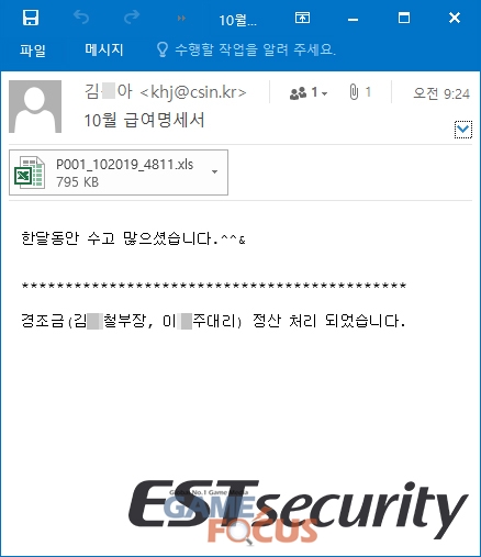 이번 공격은 악성 파일을 첨부한 이메일을 특정 대상에게 발송하는 해킹 이메일 공격 방식을 사용하고 있으며, 많은 국내 기업이 급여를 지급하는 20일, 25일 시기에 맞춰 '10월 급여명세서' 안내를 위장한 메일과 악성 파일을 배포하고 있는 것으로 확인되었다.