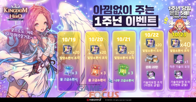 10월 19일부터 10월 23일까지 진행되는 이번 이벤트는 매일 게임에 접속만 해도 '빛암 소환서 조각', '물/불/나무 고급 소환서', '작은 기술의 요정' 등 다양한 아이템을 지급하고, 5일간 연속으로 출석할 경우 고급아이템 '전설의 빛어둠 소환서'를 증정한다. 특히, 1주년 당일인 23일에는 전투에 대한 보상으로 은화를 5배 더 제공하는 이벤트도 진행된다. 여기에 '기술의 요정 조각'을 획득할 수 있는 이벤트 균열도 10월 22일, 23일 이틀 간 오픈된다.