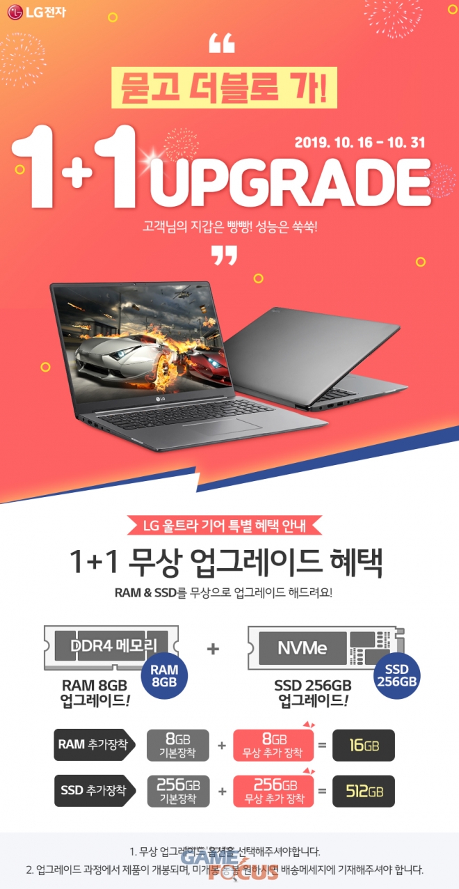 2019년 10월 31일까지 진행되는 이번 행사 중에 'LG 울트라기어 17U790-PA56K' 모델을 구매하면, 기본 사양에서 8GB 메모리와 256GB NVMe SSD가 추가 장착되어 고객에게 배송된다. 따라서 총 16GB의 메모리와 총 512GB NVMe SSD로 용량이 2배 확장되며, 더욱 향상된 성능과 넉넉한 저장공간을 사용할 수 있다.