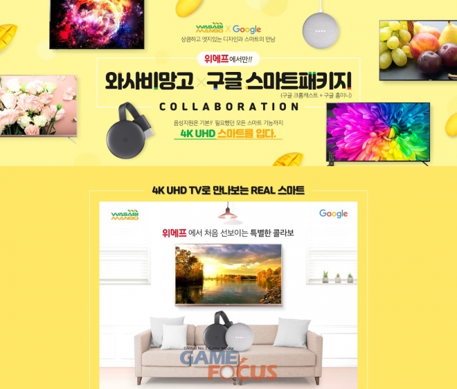 와사비망고(대표이사 김환준가 구글과의 콜라보레이션 기획으로 와사비망고의 UHD TV와 구글의 스마트패키지(구글 크롬캐스트3 + 구글 홈미니)를 특별한 가격과 혜택으로 판매하는 행사를 진행한다. 와사비망고의 대표적인 인기모델 5종을 대상으로, 개별 구매보다 저렴한 가격에 구매가 가능하며 추가로 최대 13%의 할인 혜택이 주어지는 행사이다.