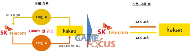 카카오와 SK텔레콤은 파트너십을 공고히 하기 위해 약 3,000억원 규모의 주식을 상호 교환한다. 카카오는 SK텔레콤에게 신주를 발행하고, SK텔레콤은 자사주를 카카오에 매각하는 방식이다. 이를 통해 카카오는 SK텔레콤 지분 1.6%, SK텔레콤은 카카오 지분 2.5%를 보유하게 된다.