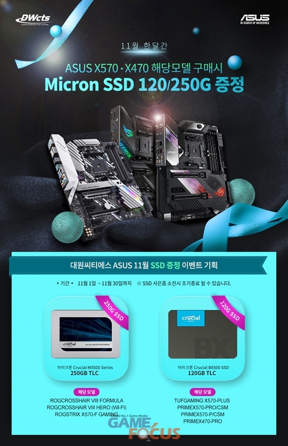 이벤트 대상 제품은 X570 칩셋 기반의 메인보드 6종과 X470-PRO 1종, 총 7가지로 ASUS ROG CROSSHAIR VII FORMULA, ASUS ROG CROSSHAIR VIII HERO (WI-FI), ASUS ROG Strix X570-F Gaming 구입 시 마이크론 크루셜 MX500 250GB를, ASUS PRIME X570-P CSM, ASUS PRIME X570-PRO CSM, ASUS TUF X570-PLUS GAMING, ASUS PRIME X470-PRO 구입 시 마이크론 크루셜 BX500 120GB를 증정한다.