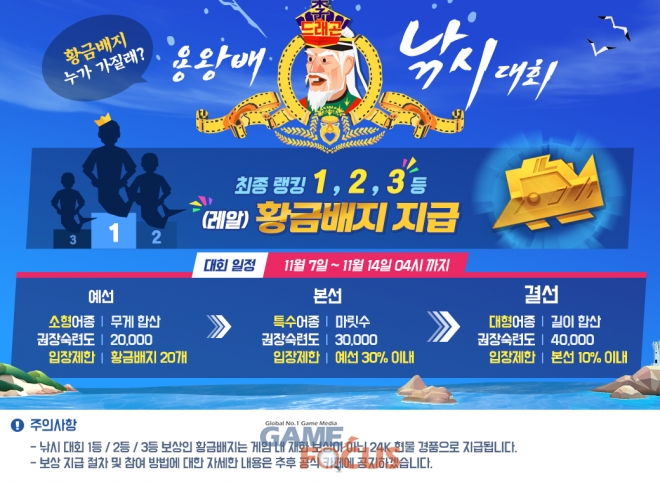 예선은 소형어종 무게합산, 본선은 특수어종 마릿수, 결선은 대형어종 길이합산 방식으로 치러지기에 각각의 특성에 맞는 장비와 서포터 캐릭터를 준비해 출전하는 게 좋은 성적을 거둘 수 있는 비결이다. 대회 관련 자세한 공지는 공식 카페를 통해 안내한다.