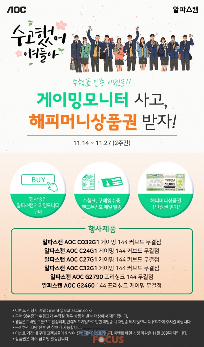 (주)알파스캔이 수능 시험을 마친 수험생들을 응원하기 위해 게이밍 모니터 구매시 해피머니상품권 1만원 권 증정 행사를 진행한다.