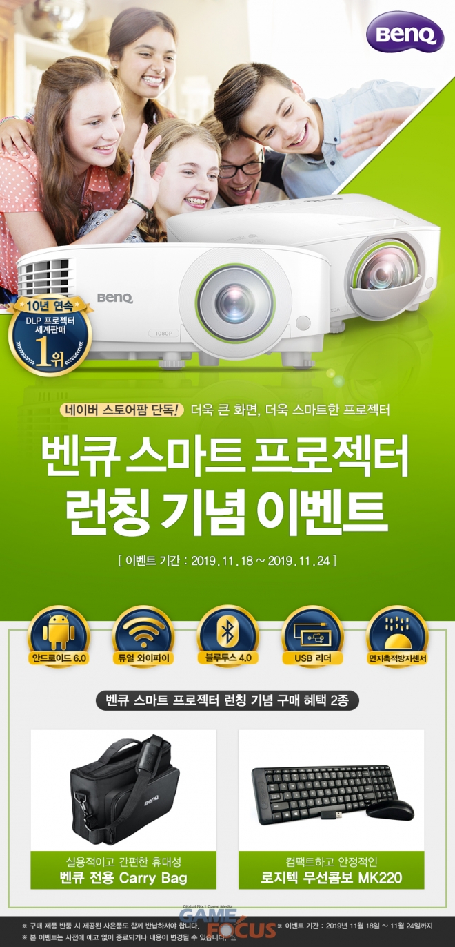 벤큐코리아 프로젝터 공식 수입원 오진상사(대표 승만호)와 함께 진행하는 이번 출시 기념 행사는 11월 18일부터 11월 24일까지 7일간 네이버 스토어팜 단독으로 진행된다. 벤큐 스마트 프로젝터 4종(EH600, EX600, EW800ST, EX800ST) 구매 시 벤큐 전용 프로젝터 가방과 로지텍 무선 콤보(MK220)를 출시 기념 사은품으로 제공한다.