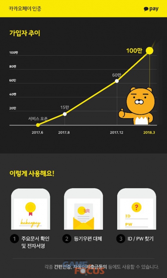 카카오페이(대표 류영준)의 블록체인 기반 모바일 인증 서비스 '카카오페이 인증'이 출시 8개월 여만에 가입자 수 100만명을 돌파했다.